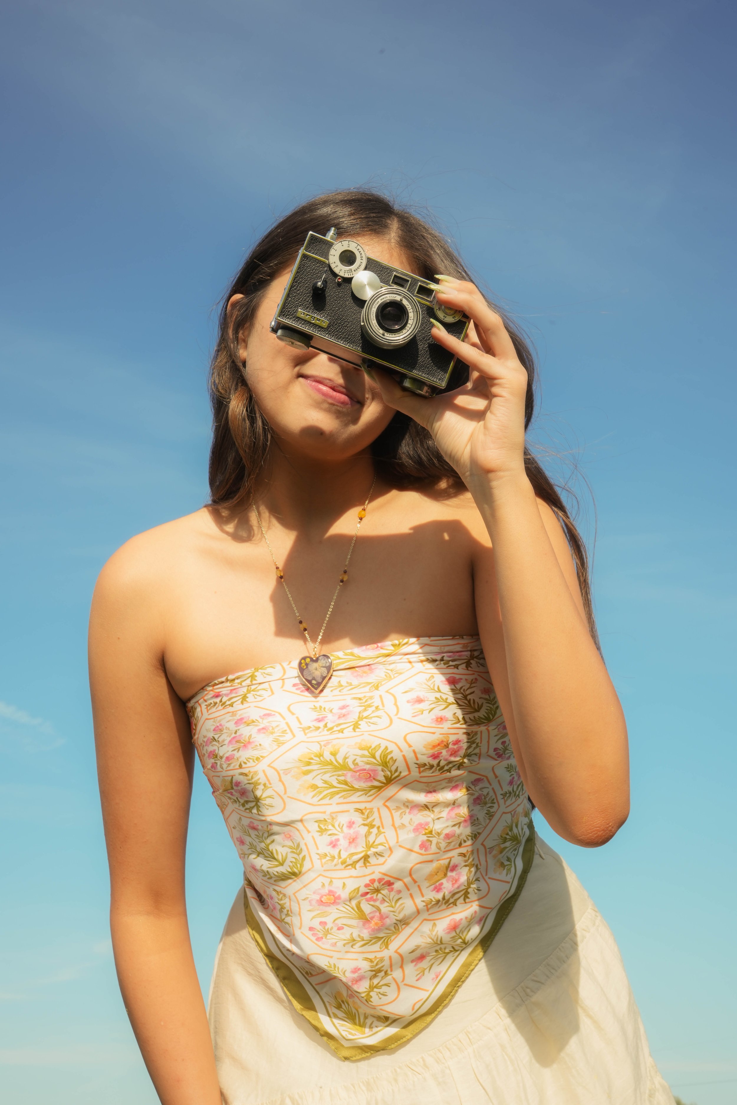 A woman with long dark hair and a floral strapless top sits outdoors among green plants with yellow flowers, looking at a vintage camera in her hands.
