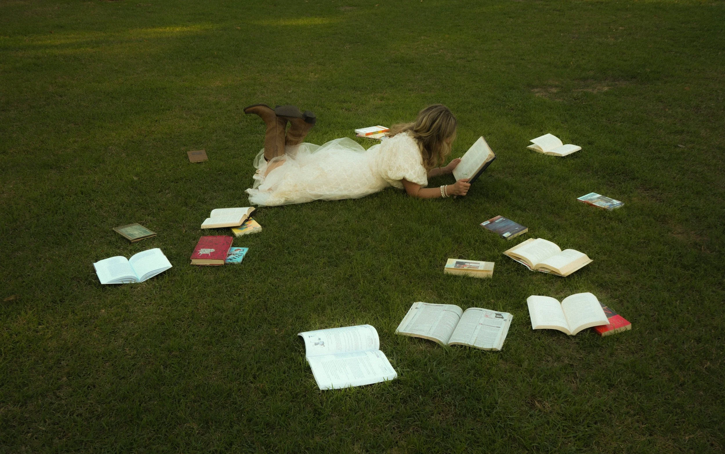 A woman in a white dress and brown boots is lying on her stomach on the grass in a park with trees and a wooden fence in the background, reading a book. Several other books are scattered around her.