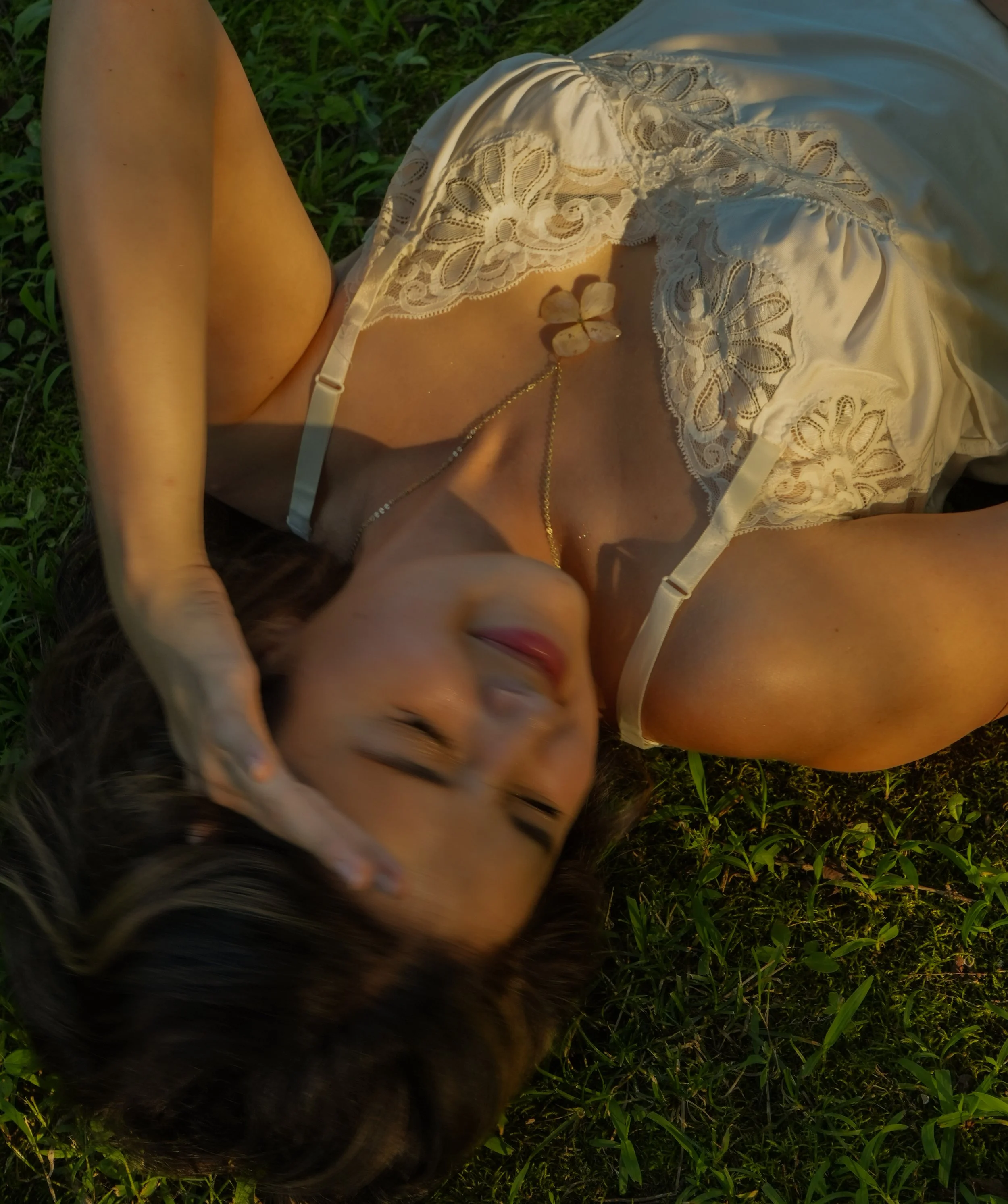 A woman lying on grass, wearing a white lace dress, with a flower-shaped necklace, and her eyes closed.