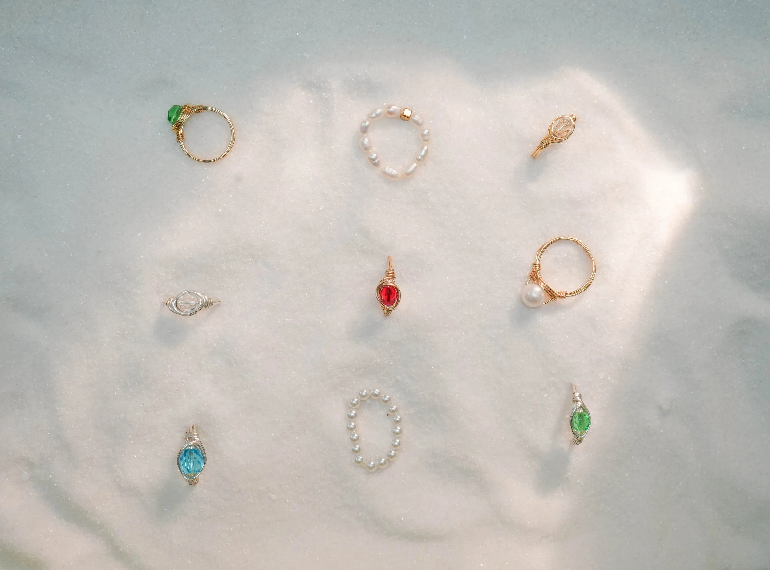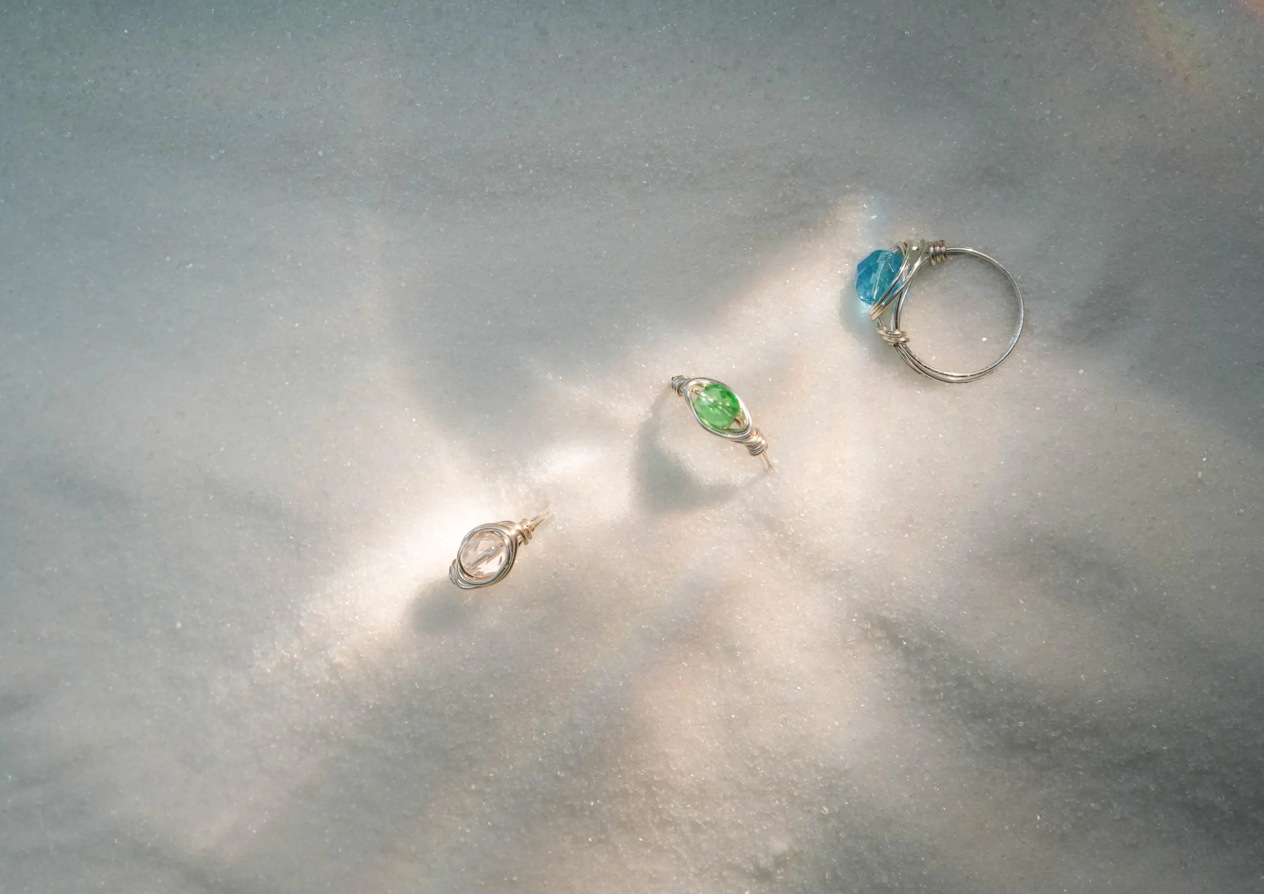 Three wire-wrapped rings with colored stones resting on a sparkly, white, sandy surface.