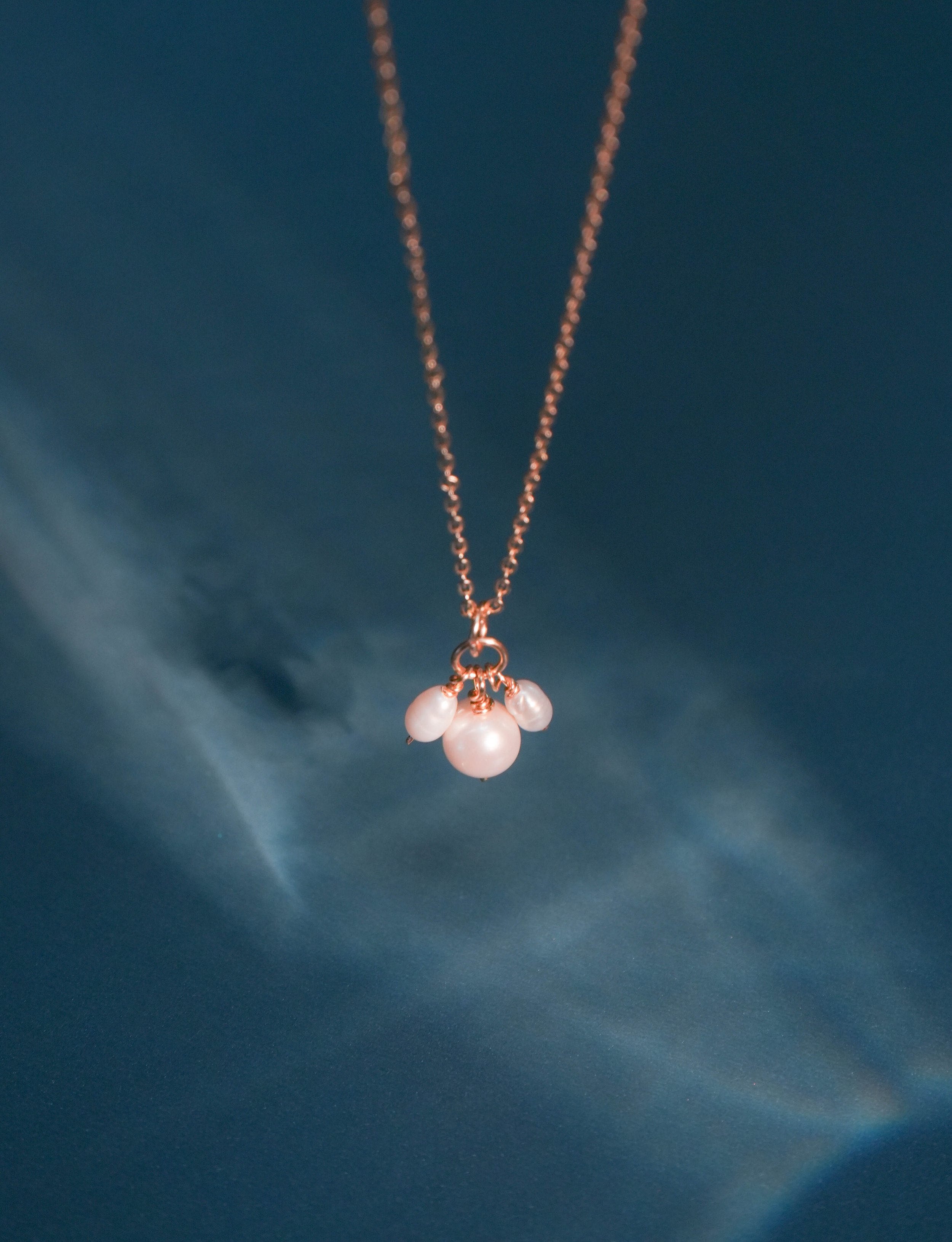 Pendant necklace with a chain and three small pearls hanging from a rose gold setting, set against a dark blue background.