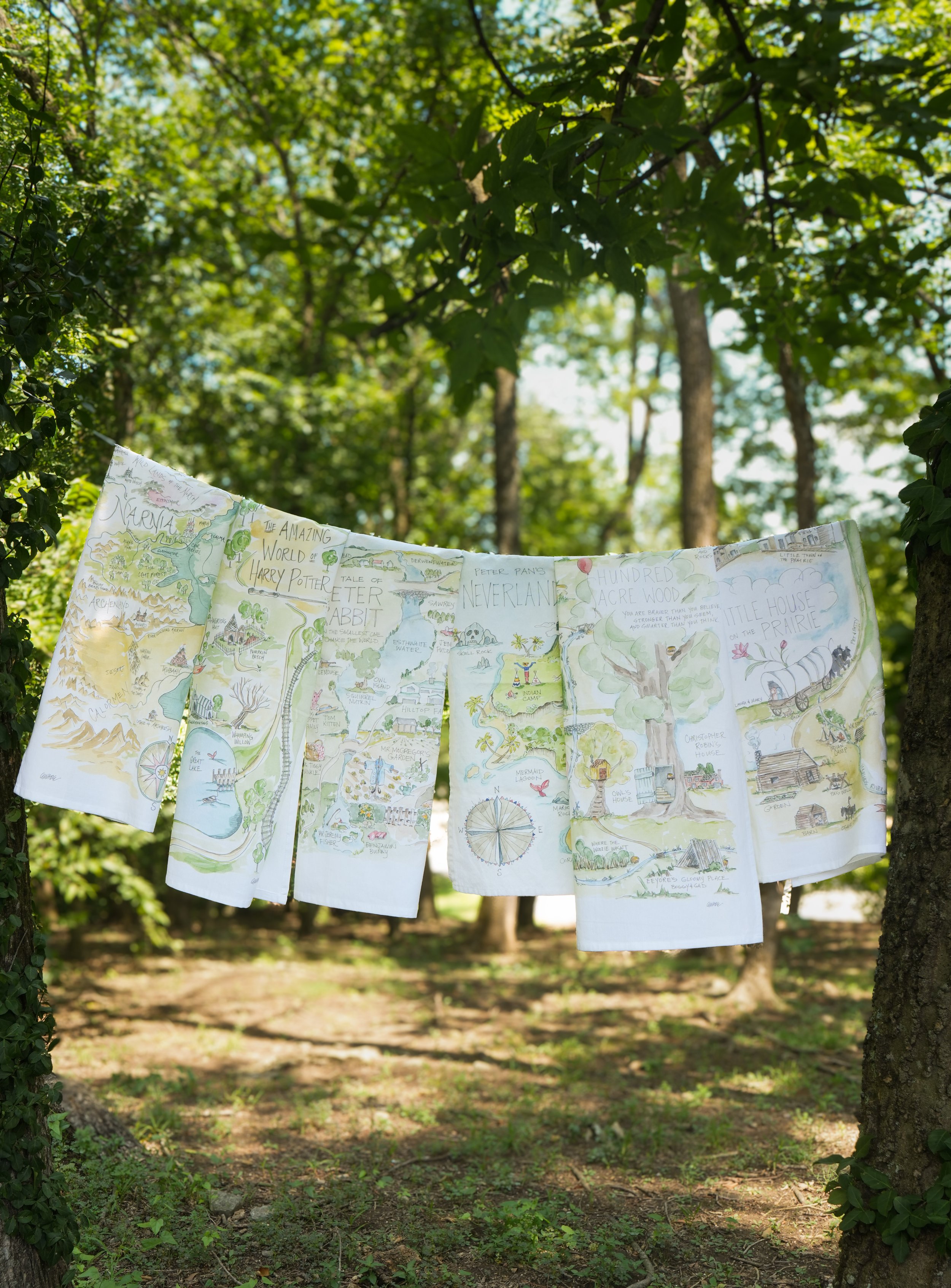 Colorful illustrated maps and drawings hanging on a clothesline in a green, wooded outdoor area.