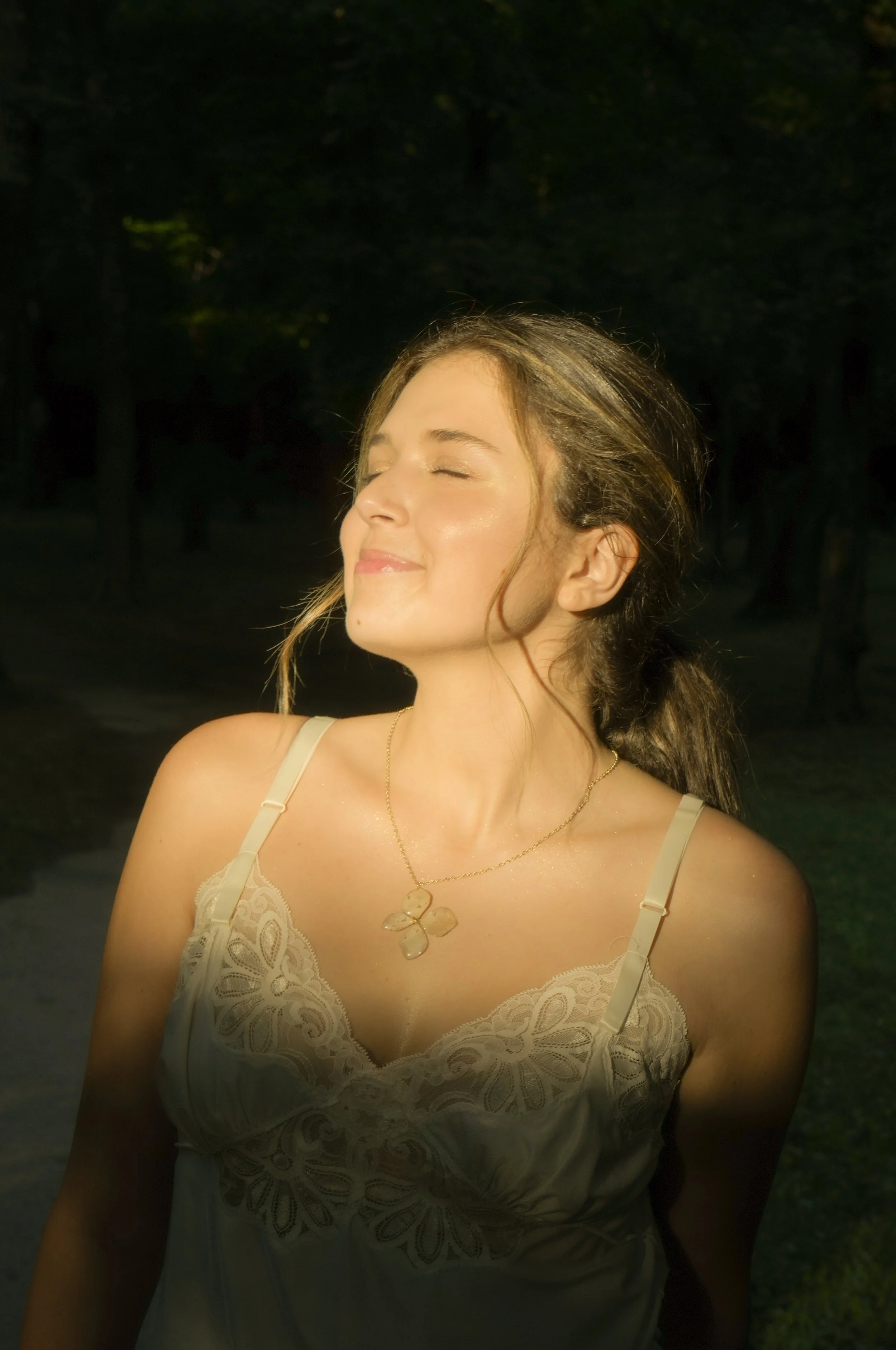 A woman with closed eyes and a content smile, enjoying sunlight in a park at dusk. She is wearing a cream-colored lace camisole and a gold necklace with a four-leaf clover pendant.