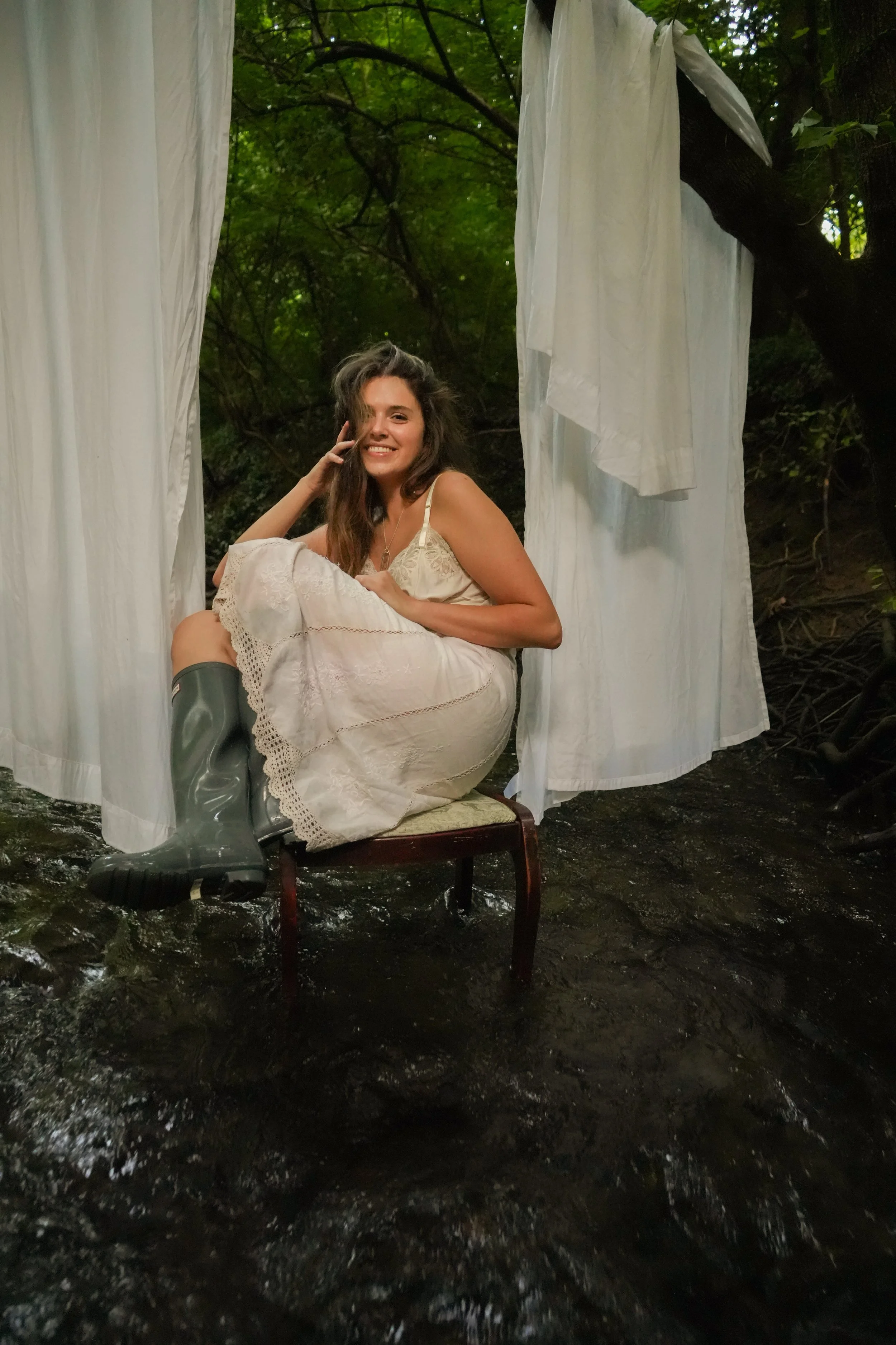 A woman sitting on a chair in a creek, surrounded by hanging white sheets, smiling with long hair, wearing a cream dress and gray rubber boots.