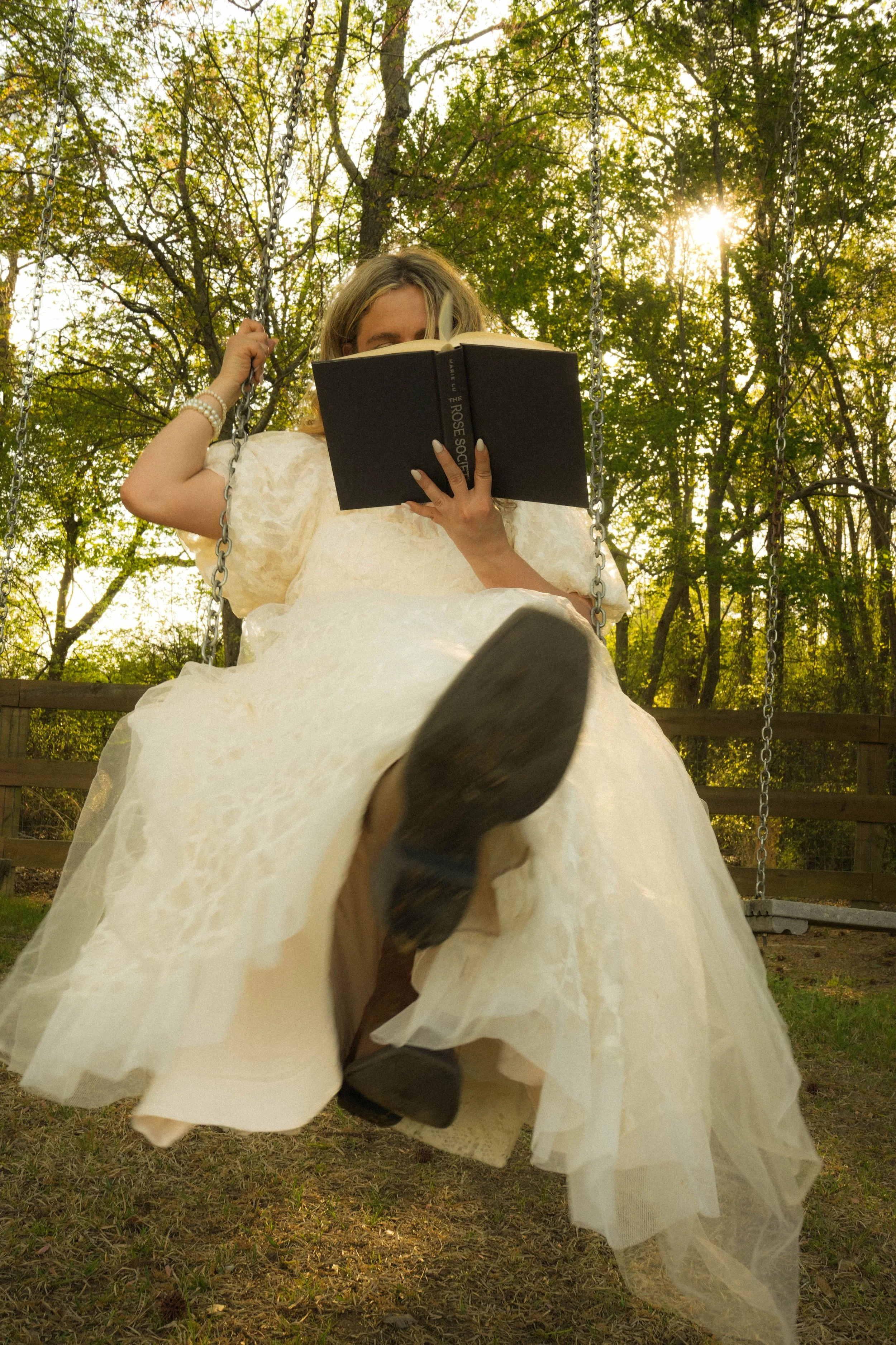 A woman in a wedding dress sitting on a swing, reading a book outdoors during sunset.