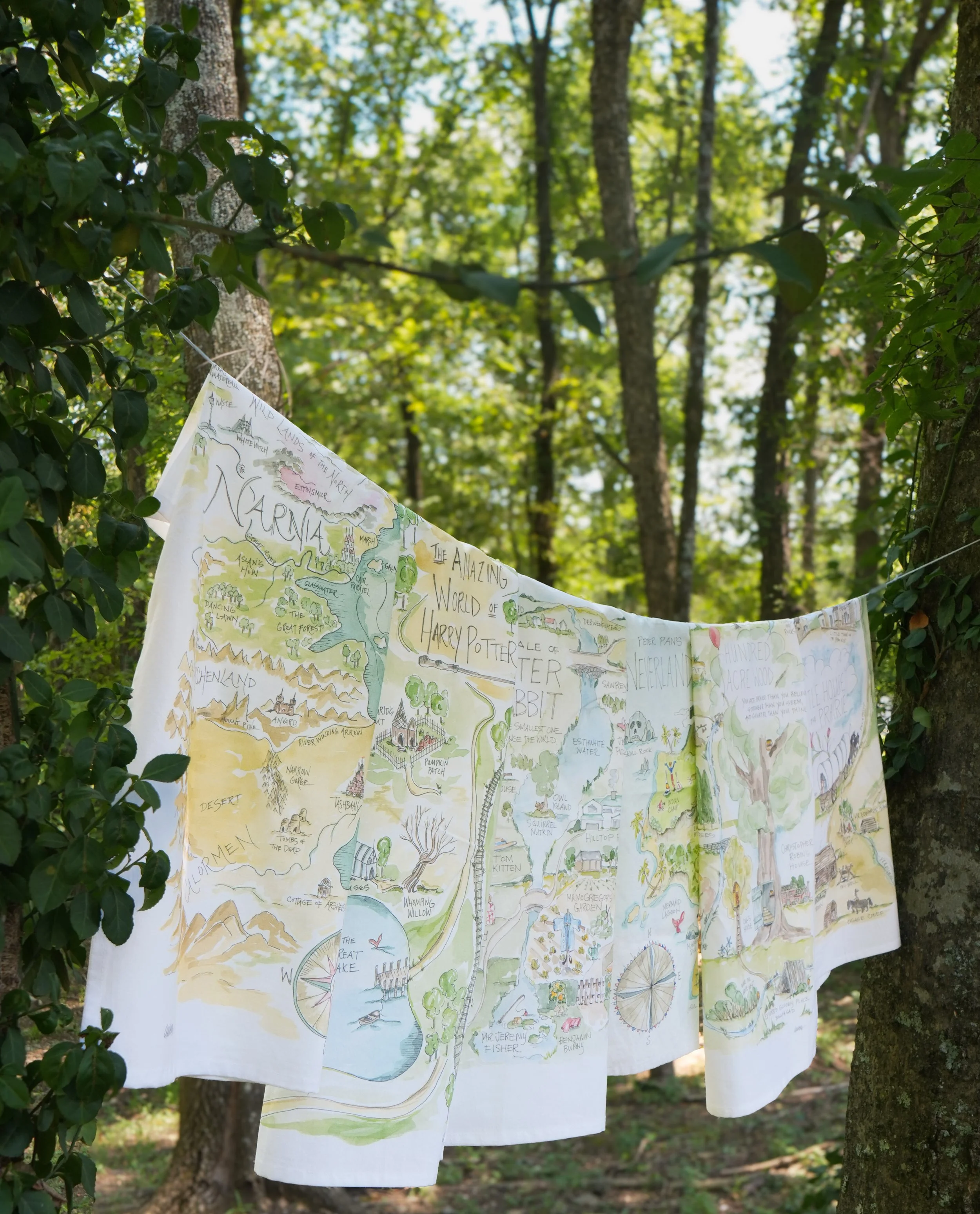 Colorful illustrated map of the Wizarding World of Harry Potter hanging between trees in a forest.