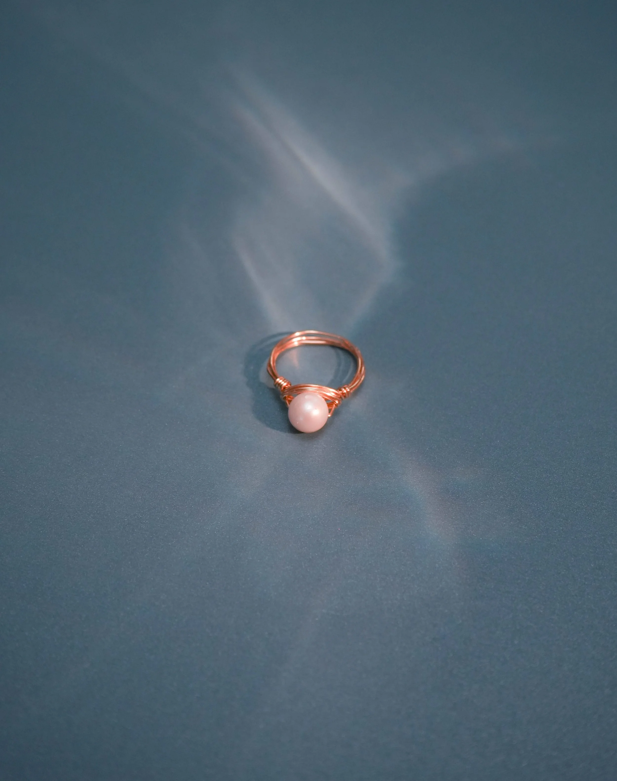 A gold ring with a single white pearl, placed on a blue surface with light reflecting around it.
