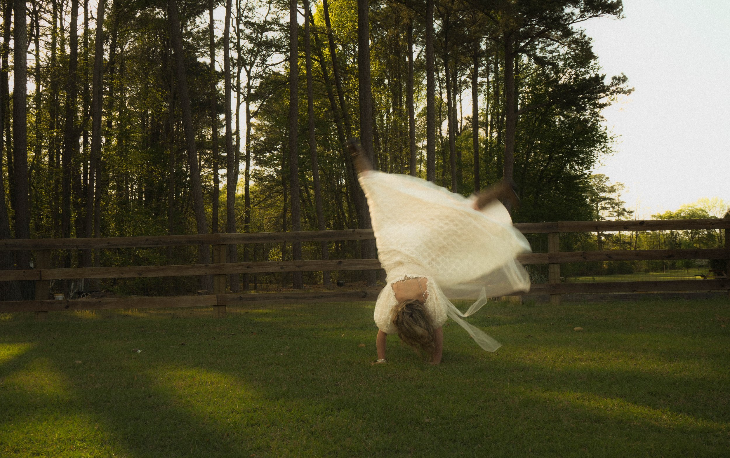 A young girl in a white dress is performing a cartwheel on grass in a backyard, with a wooden fence and tall trees in the background.