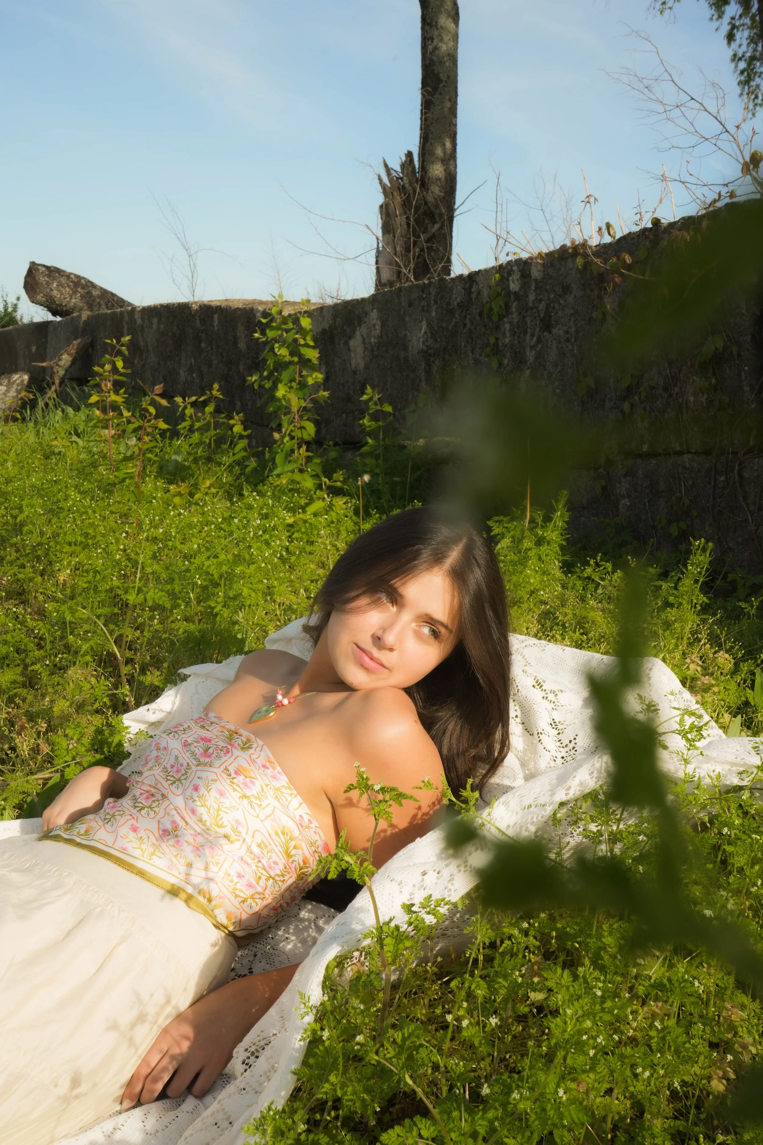 A young woman with long dark hair lying on her side in green foliage. She is wearing a strapless dress with a floral pattern and a necklace, and is looking to the side. There is a white lace cloth beneath her and an old stone wall behind her.