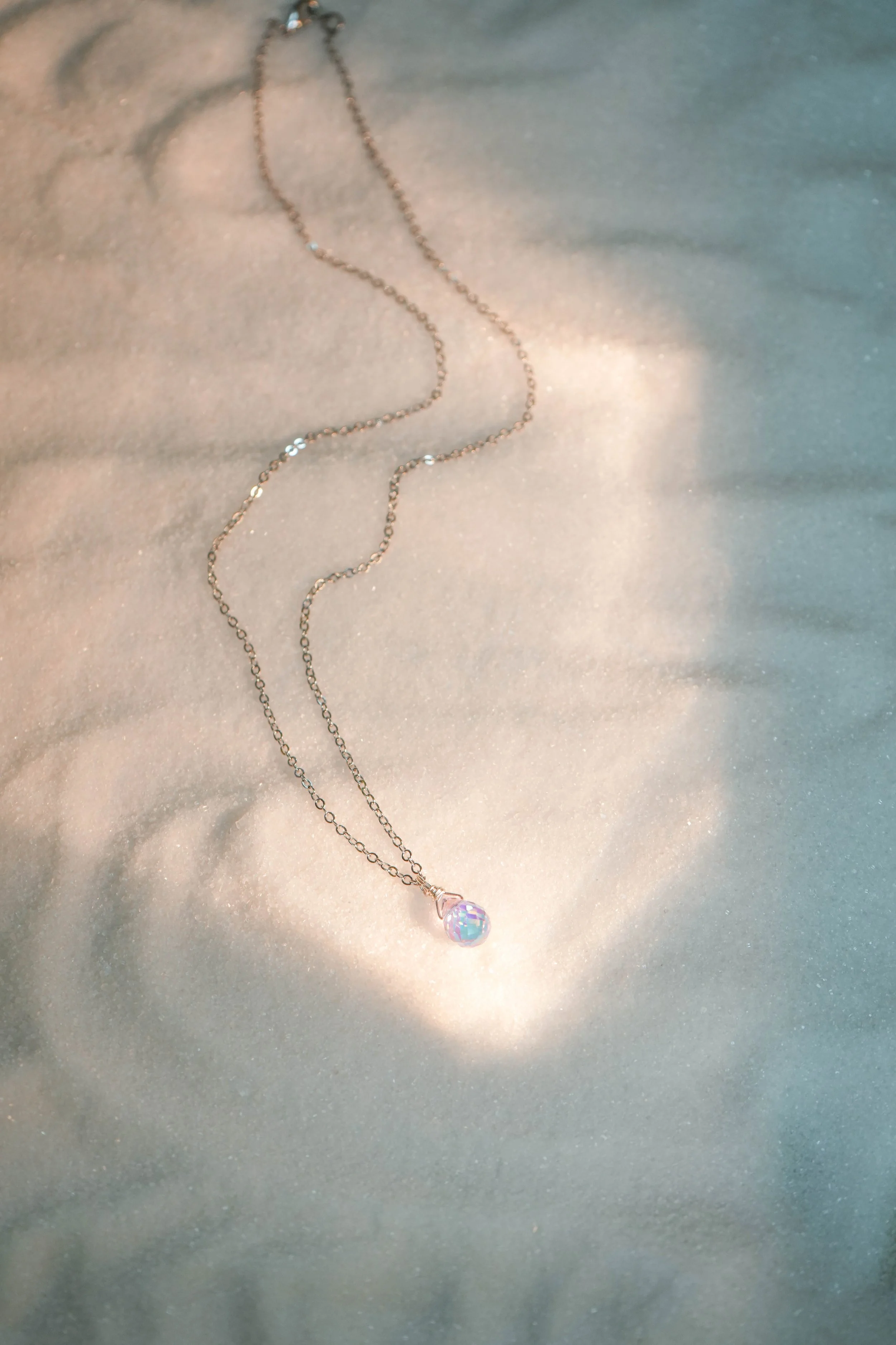A delicate necklace with a small, iridescent pendant resting on a glittery, light-colored surface.