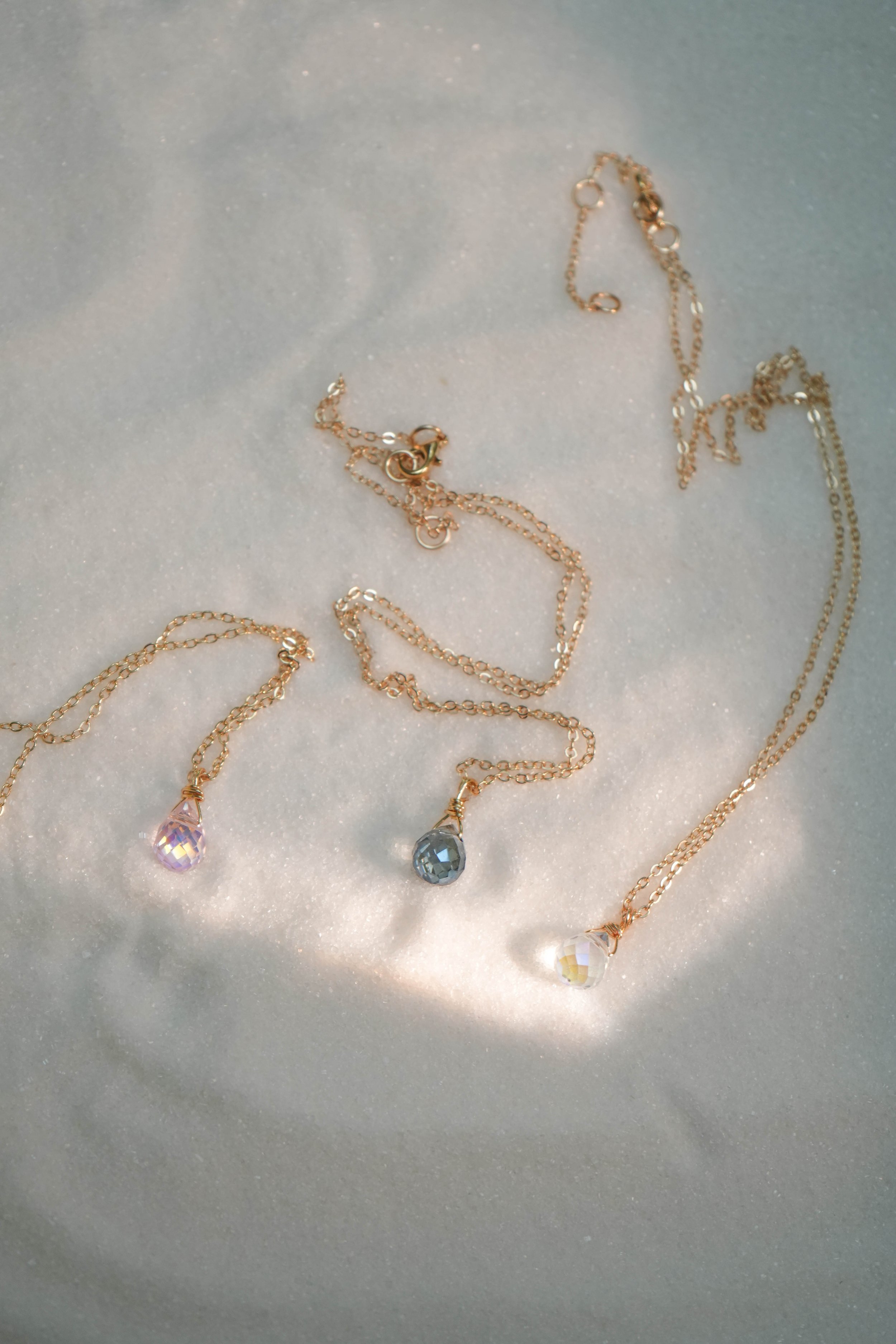 Three delicate necklaces with pendant stones in pastel colors, arranged on white fabric.