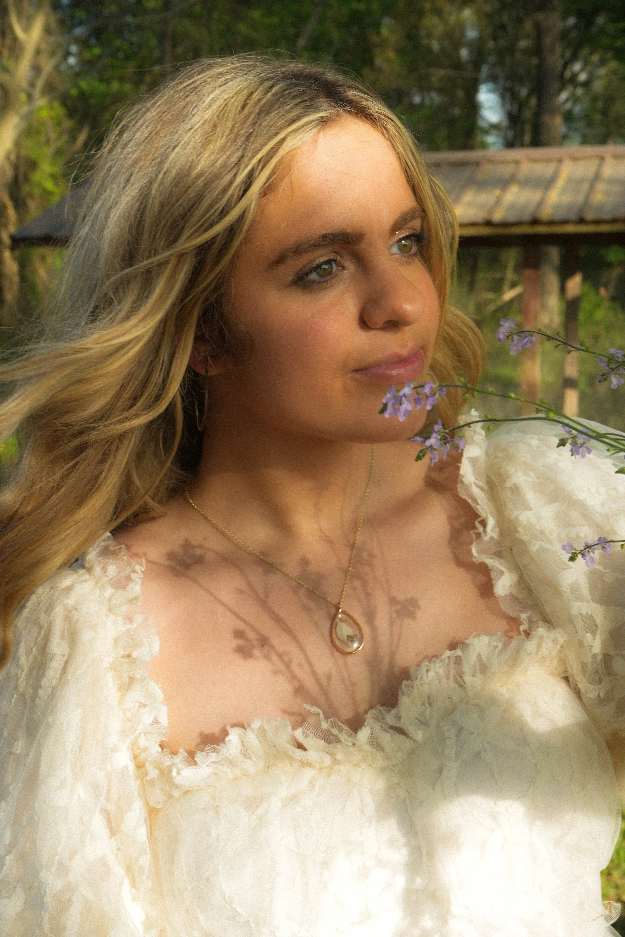 A young woman with long blonde hair in a white lace dress holding a purple flower, with her face and shadows of the flower's branches cast on her chest, outdoors with trees and a wooden structure in the background.