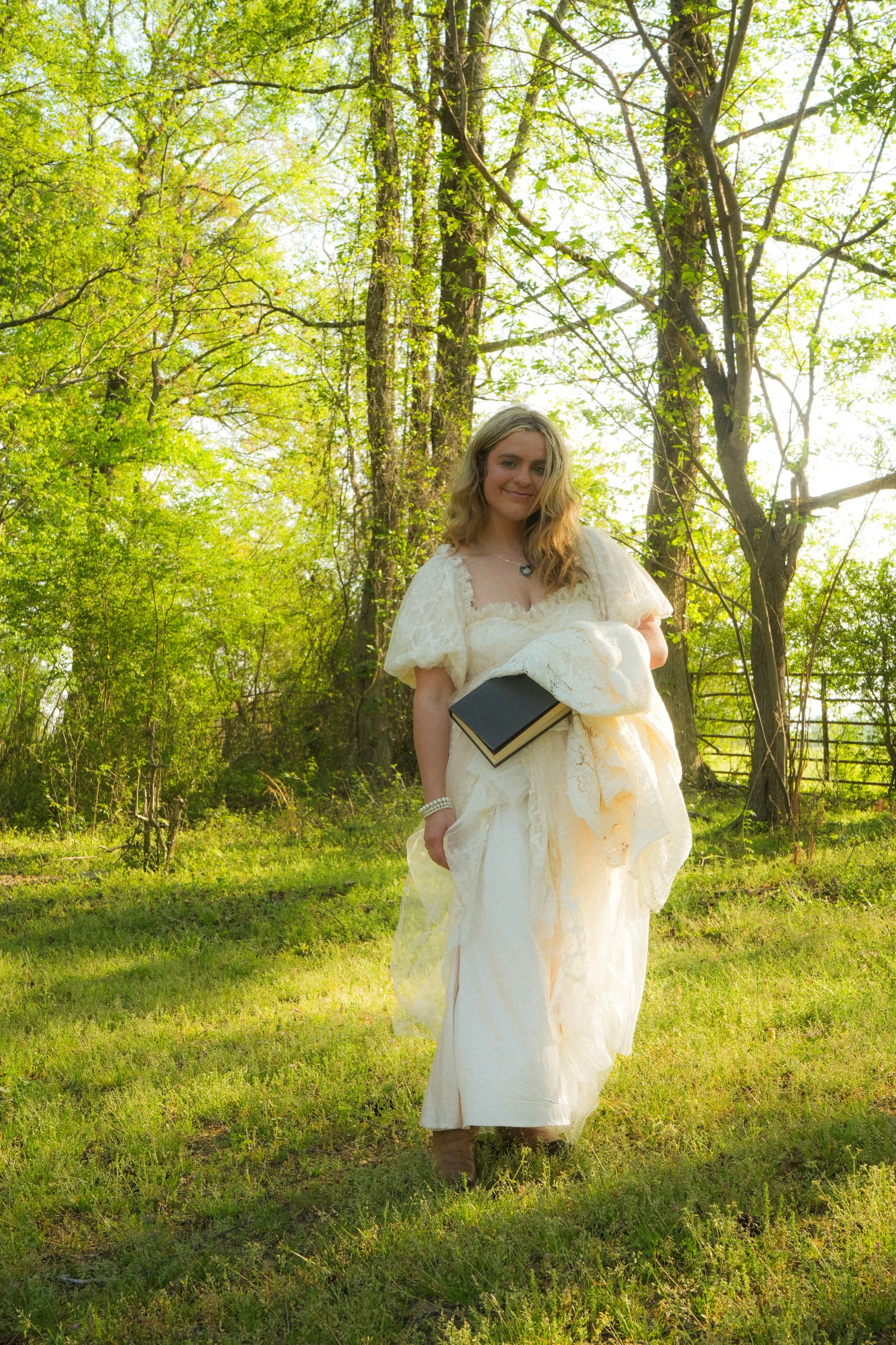 A young woman in a cream-colored vintage dress stands outdoors on a grassy area, holding a book and a white shawl, with trees and sunlight in the background.