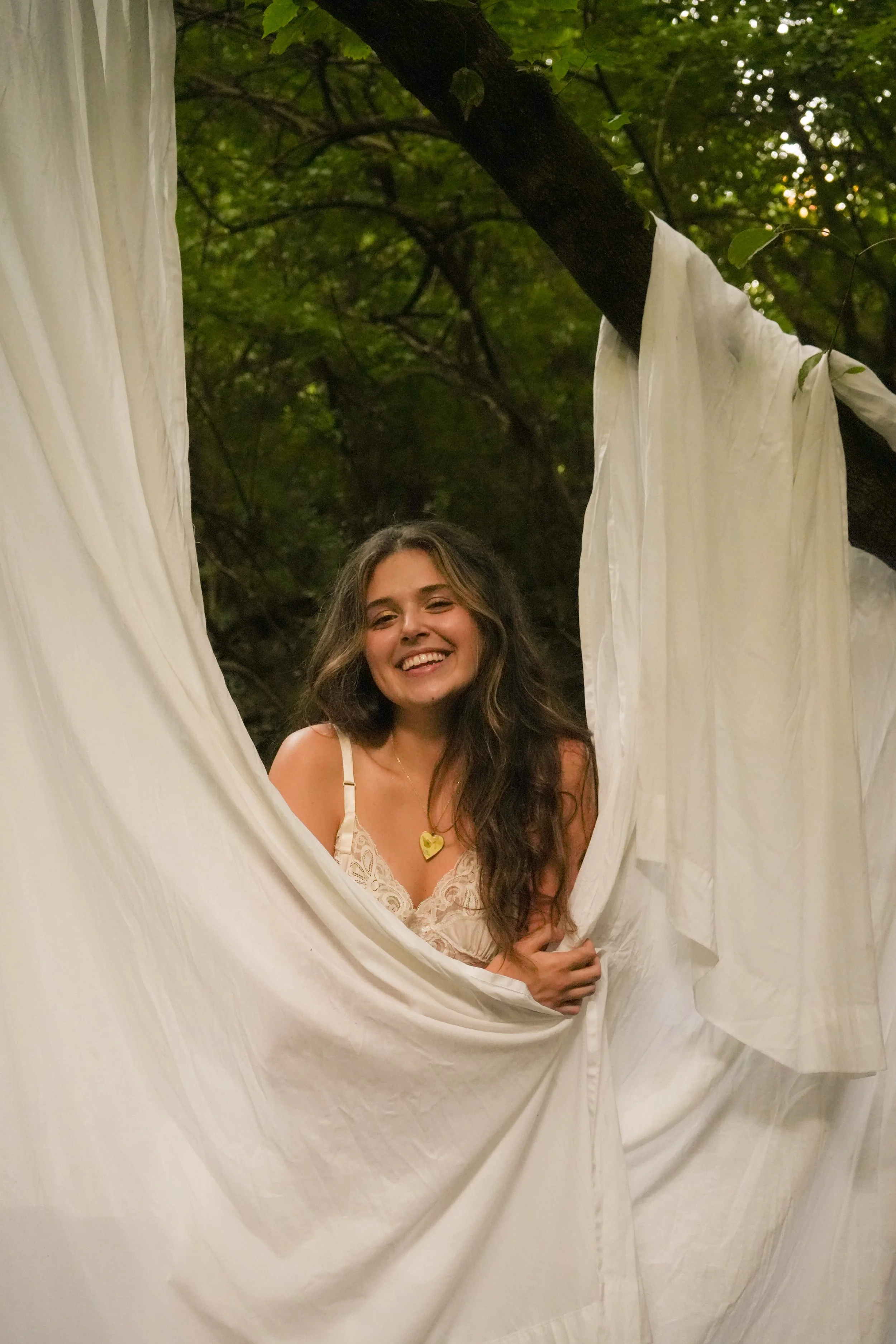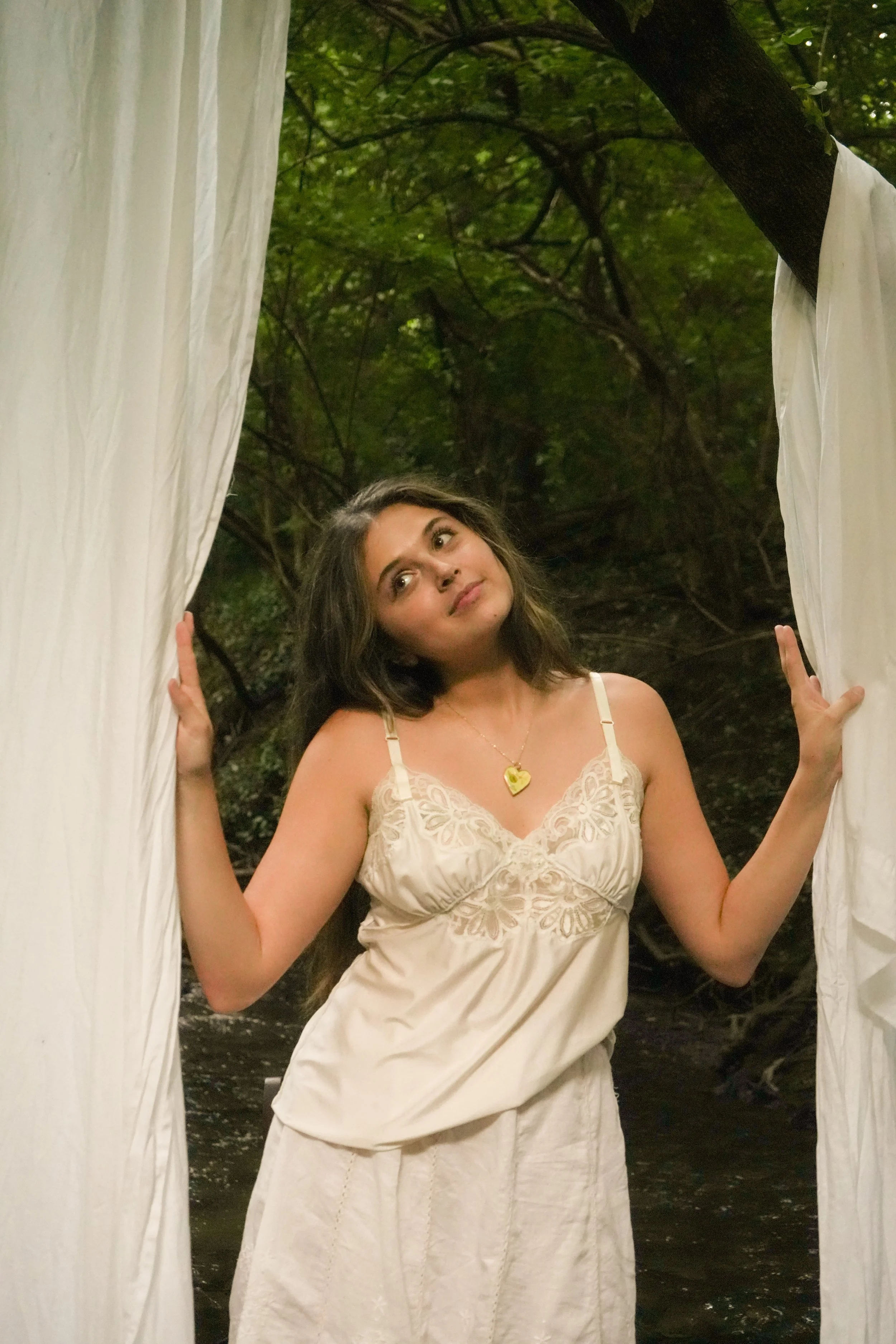 A woman with long brown hair wearing a cream-colored dress with lace details and a heart-shaped necklace, standing between white curtains in a forest setting, holding the curtains open and looking thoughtful.