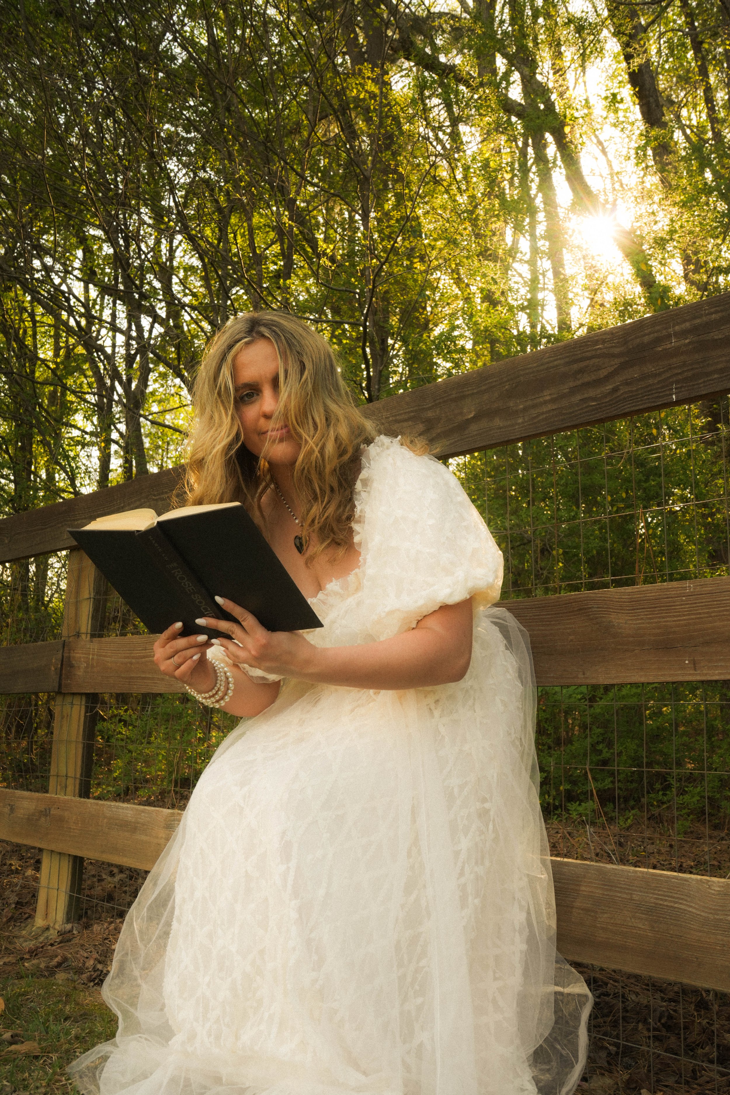 Woman in a white dress holding a book, standing by a wooden fence in a wooded area during sunset.