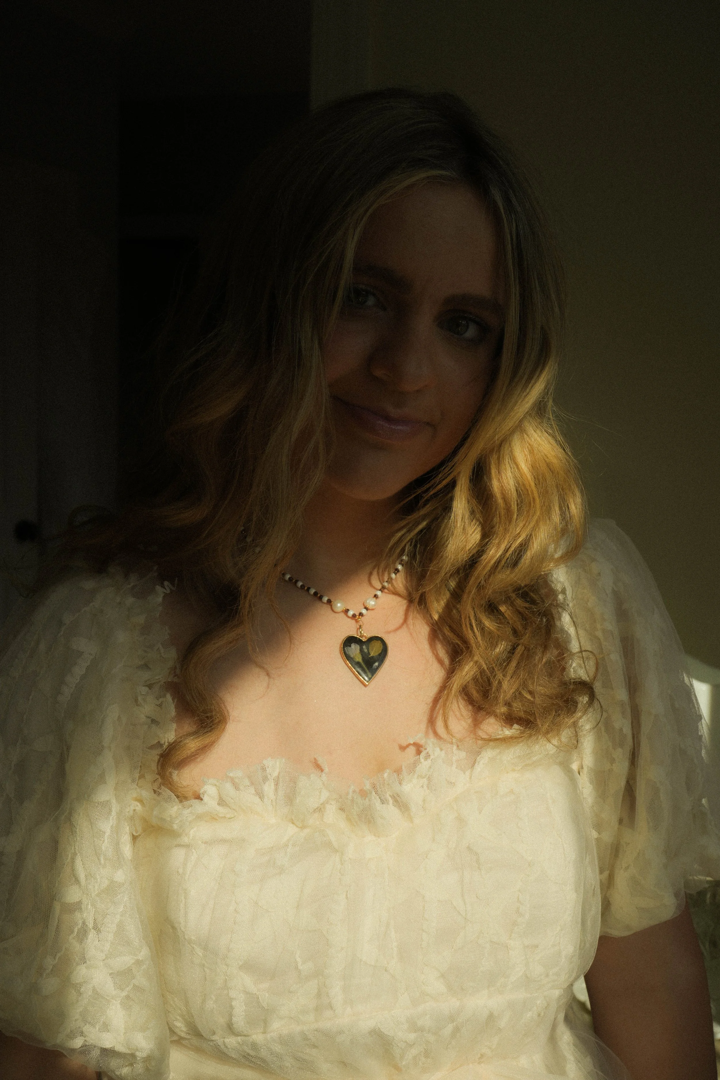 A woman with wavy blonde hair, wearing a cream-colored dress and a heart-shaped pendant necklace, standing in a dimly lit room.